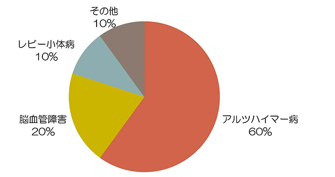 世界で最も多い認知症で、80歳以上では20%以上がアルツハイマー型認知症と言われています。日本でも認知症の約68%と最も多くを占めています。